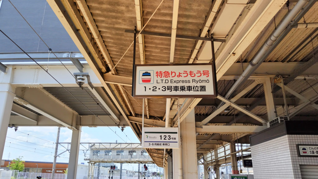 特急リバティの停車位置が記されています。停車する特急は東武伊勢崎線方面からのりょうもうのみ。東武日光線のけごんやきぬなどの特急列車は春日部駅に停車します。