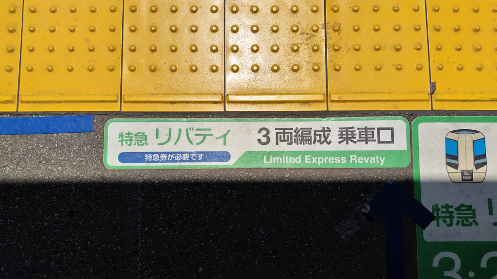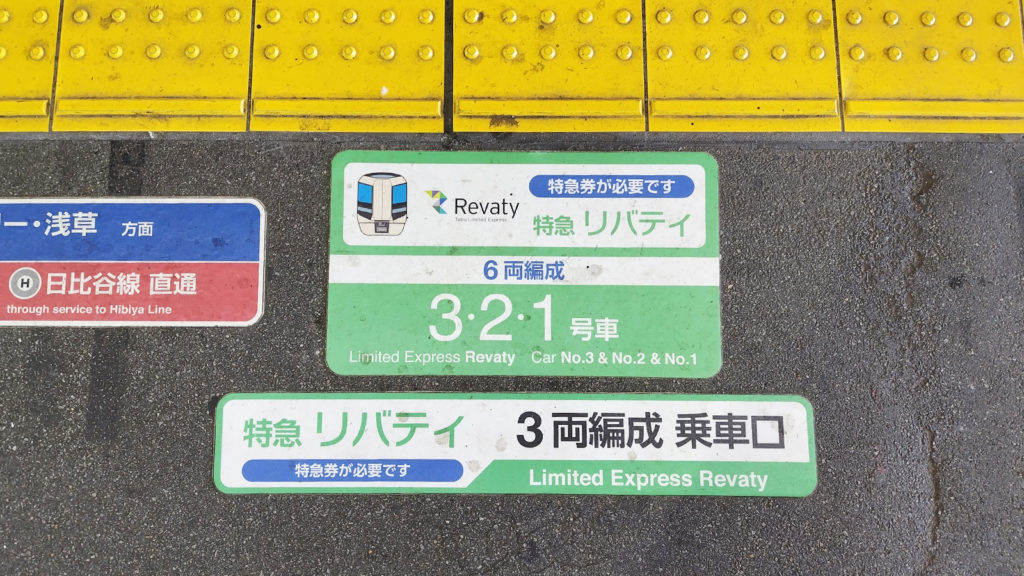 東武伊勢崎線5番線ホームには特急列車も停車しますので、あちこちに特急乗車位置を示す印がございます。