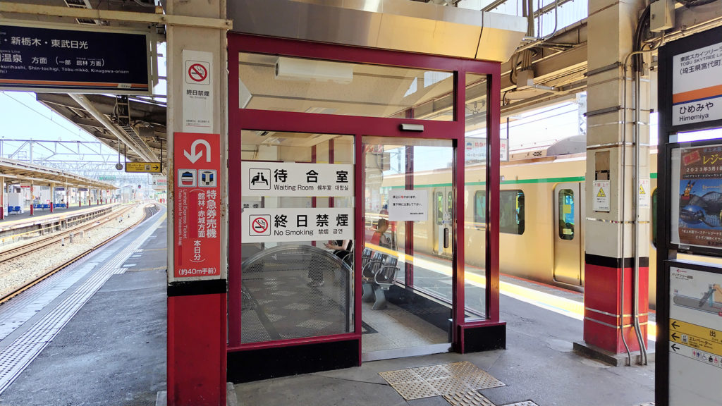 東武伊勢崎線から東武日光線へと、それぞれの乗り換え駅でありますので4、5番線ホームには待合室が設置してございます。ありがたいですね。