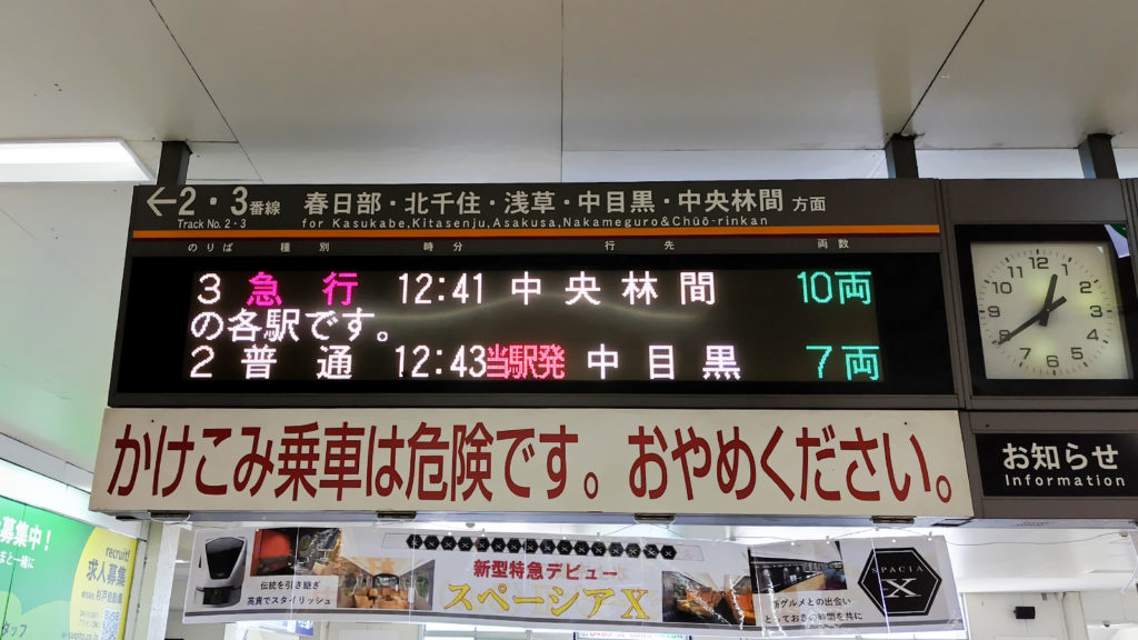 では、東武伊勢崎線、東武日光線から東京方面に向かって運行される上り線にはどれに乗っても安心なのか、というと実はそうではありません。急行などであれば東京メトロ半蔵門線、各駅であれば東京メトロ日比谷線へとそれぞれ直通で乗り入れていますので注意が必要です。