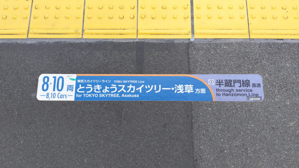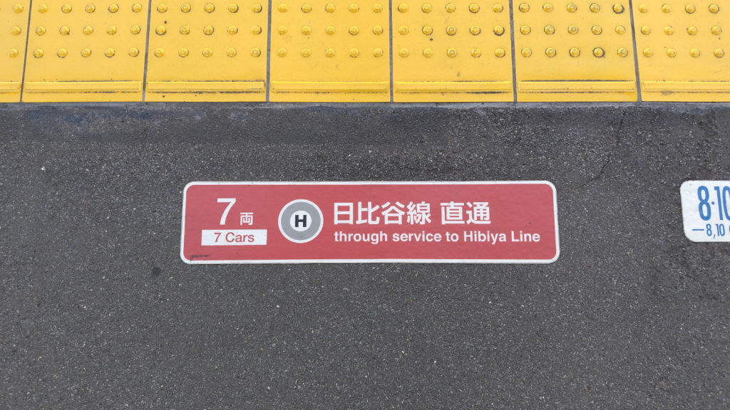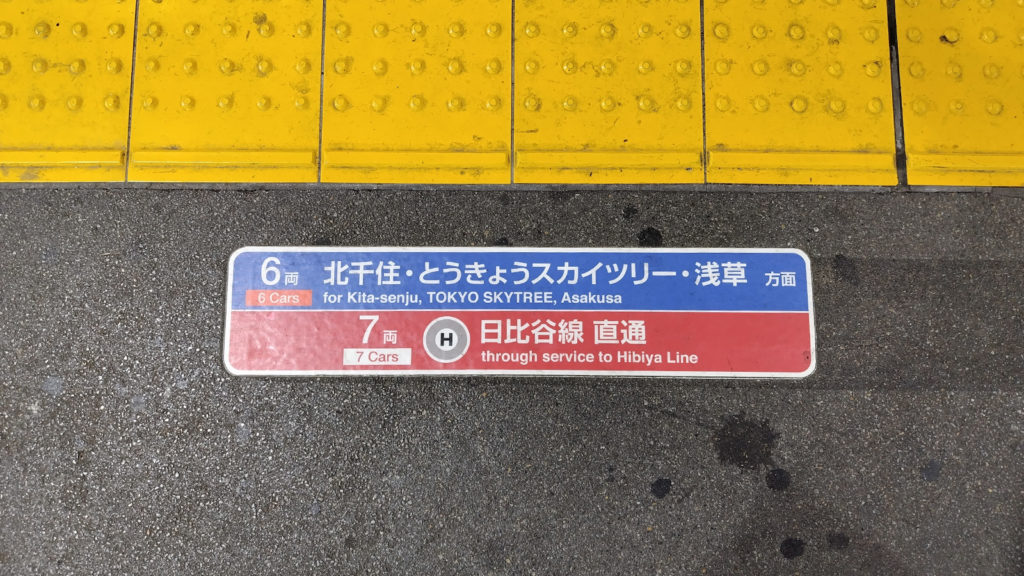 足元を見ると様々な乗車位置が記してあります。間違わないよう注意が必要です。殆どの上り方面列車は東京メトロ日比谷線や半蔵門線に乗り入れます。ちなみに当駅から北千住駅までは急行に乗車して約35分です。
