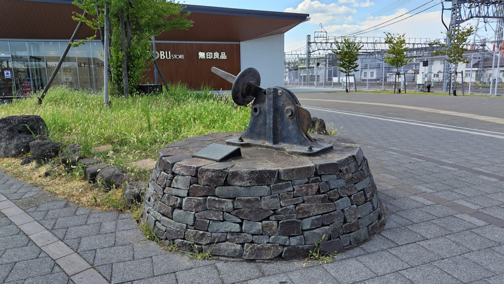 そして当時の記憶として、工場で使用されていた転轍機(てんてつき)が、西口駅前公園のモニュメントとして残されていました。