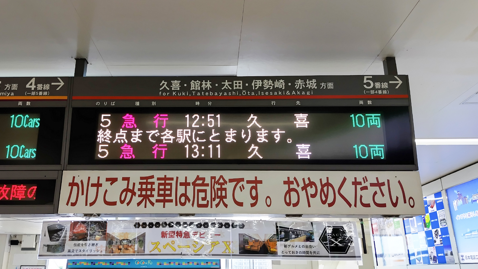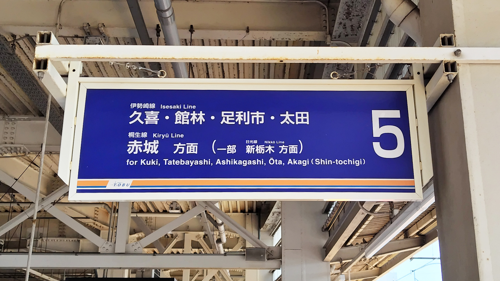 反対側の5番線ホームは、伊勢崎駅や赤城駅方面へと向かう東武伊勢崎線のホームです。東急2020系の久喜行列車が到着していました。結構埼玉の奥まで東急電鉄の列車は運行されています。東急に乗車したのに寝過ごしたら埼玉だったなんていう話は、たまにテレビで見かけます。